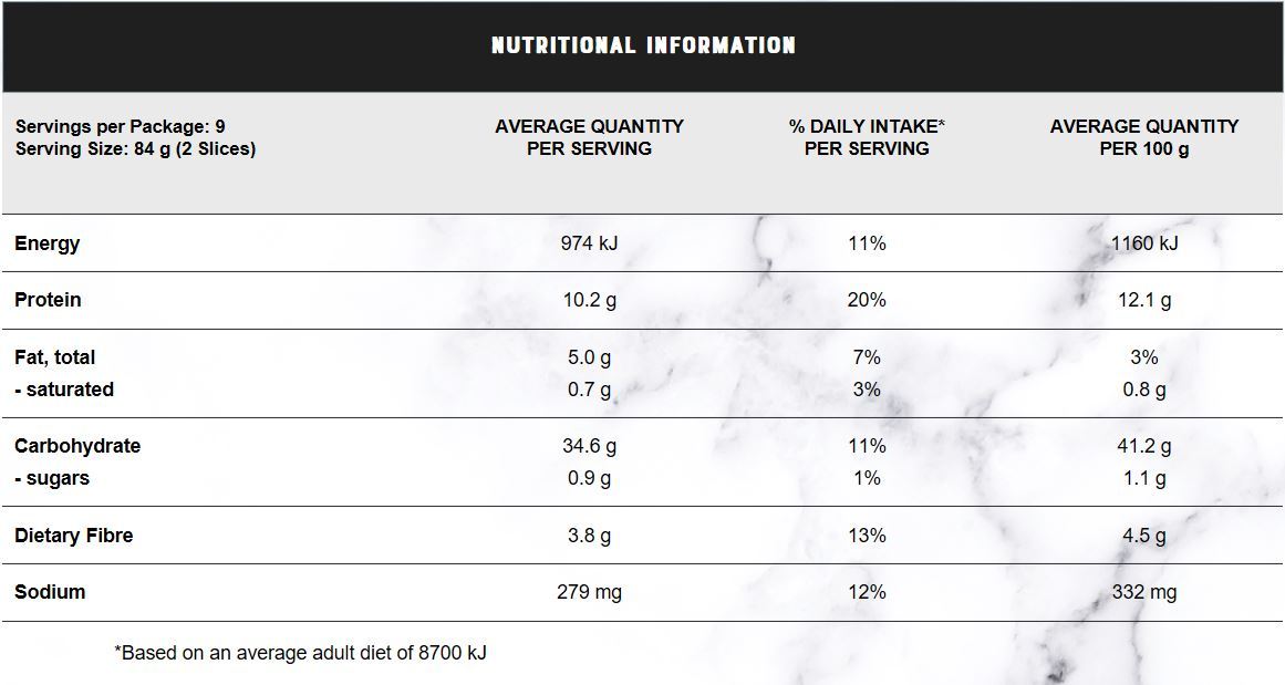 Wheat Flour, Water, Baker’s Yeast, Seeds (5%) (Sunflower Seeds, Poppy Seed, Linseed, Sunflower Kernels), Mixed Grains (3.5%) (Kibbled Rye, Kibbled Wheat, Kibbled Triticale, Buckwheat, Kibbled Corn, Rolled Oats, Kibbled Barley), Dried Wheat Sourdough (3%), Wheat Gluten, Canola Oil, Vinegar, Kibbled Soy, Iodised Salt, Pumpkin Seeds (0.7%), Soy Flour, Emulsifiers (471, 472e, 481), Vitamins (Thiamin, Folic Acid).
