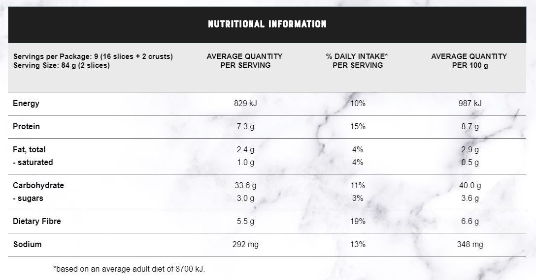 Wholemeal Whole Grain Wheat Flour (65%), Water, Wheat Flour, Baker’s Yeast, Wheat Gluten, Vinegar, Iodised Salt, Canola Oil, Soy Flour, Emulsifiers (471, 472e, 481), Vitamins (Thiamin, Folic Acid).