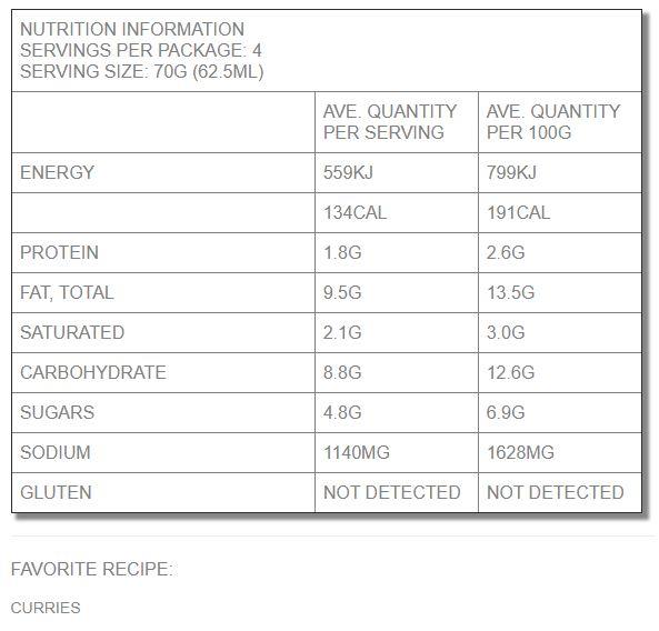 INGREDIENTS: WATER, ONION, SOYA BEAN OIL, GARLIC, CURRY POWDER (CORIANDER SEEDS, CHILLI, TURMERIC, FENNEL SEED, CUMIN, CINNAMON, NUTMEG, CLOVE, FENUGREEK) (7.5%), GALANGAL, LEMONGRASS, CHILLI (4%), SALT, SUGAR, CORN STARCH, CORIANDER SEEDS