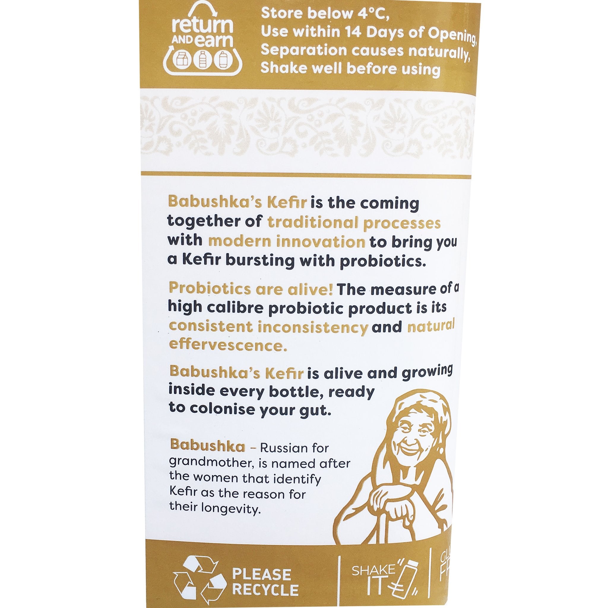 Kefir, from the Turkic "kief" describing a feeling of vitality and wellbeing, originated more than 2000 years ago from the Caucasus mountains, an area renowned for the longevity of its people. Babushka, (Russian for grandmother) is named after those centenarian grandmothers that identify kefir as the reason for their longevity.