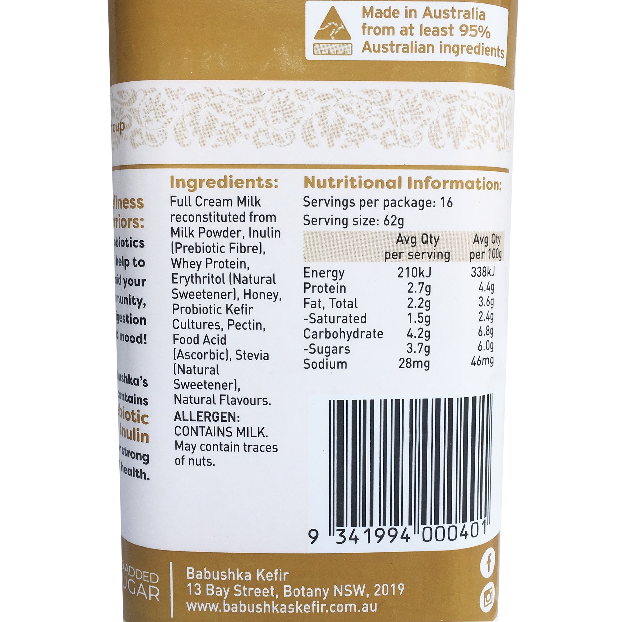 Full Cream Milk reconstituted from Milk Powder, Honey, Sugar, Inulin (Prebiotic Fibre) Whey Protein, Erythritol (Natural Sweetener), Organic Honey, Stabiliser (Pectin), Natural Flavours, Kefir Cultures, Probiotic L. Acidophilus L. Casei, B. Bifidus Cultures, Stevia Reb-A (natural sweetener), Food Acid (Ascorbic).