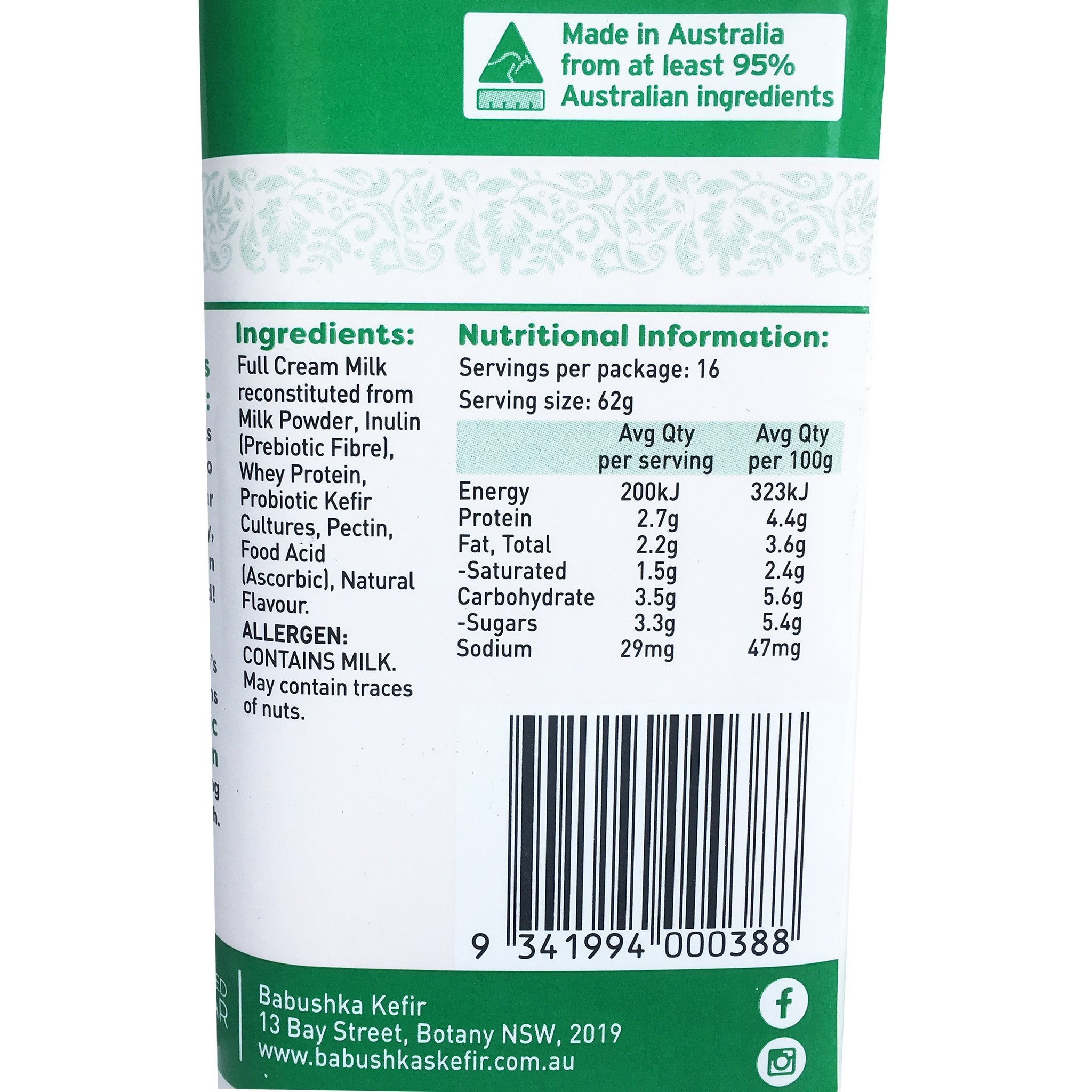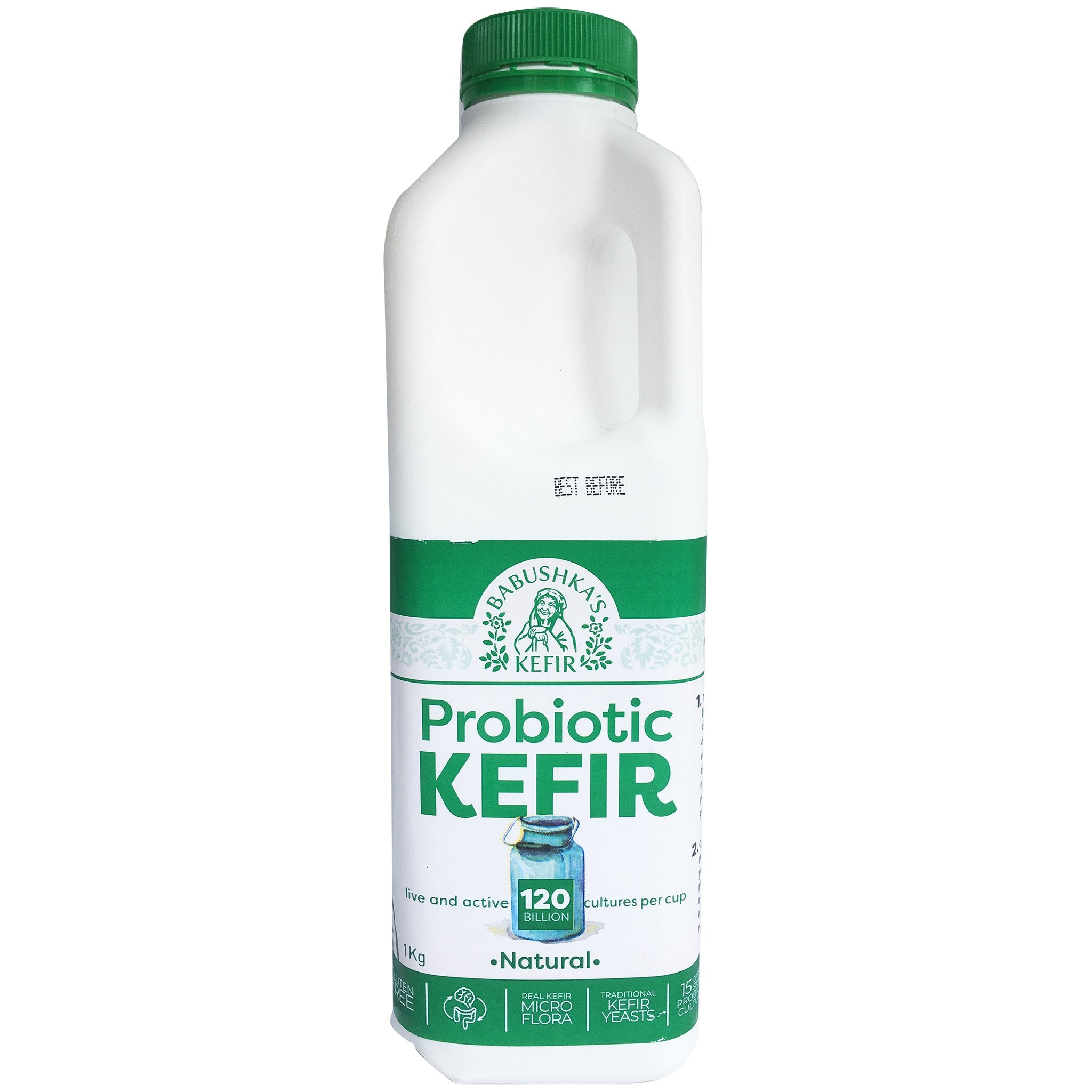 Babushka A drink To Your Health! Probiotic Kefir Yoghurt Natural. 12 Billion Friendly Bacteria Per Shot. Our kefir packed with more than 12 billion friendly live probiotic bacteria per 62 ml serve is a functional food tonic to be enjoyed by young and old everyday. Maintaining your body's inner balance naturally. 1 kg Family size.